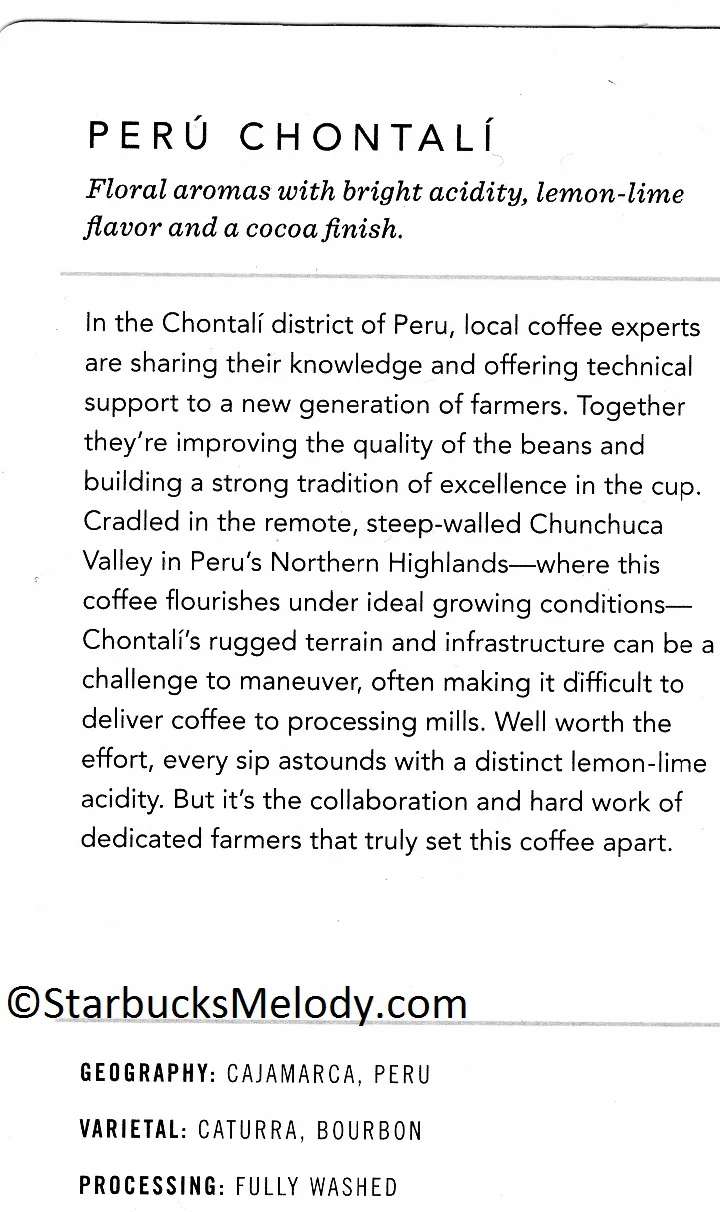 On February 2, 2017, the Starbucks Reserve Peru Chontali showed up at the Roastery, in Flavorlock packaging. This will be a national release coffee on March 21, 2017. Here is the card: